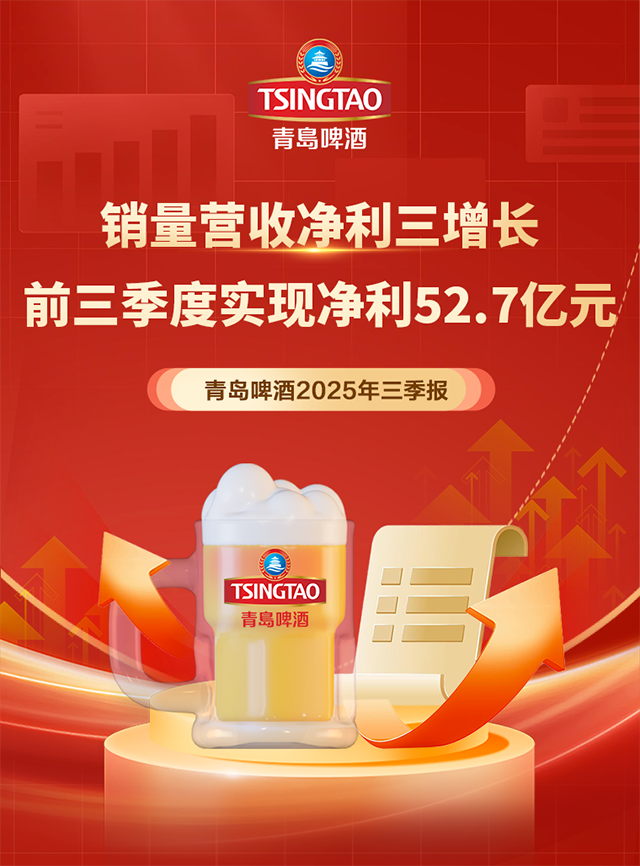 10月27日,青岛啤酒发布2025年第三季度报告。前三季度,青岛啤酒累计实现产品销量689.4万千升,实现营业收入人民币293.7亿元;实现归属于上市公司股东的净利润人民币52.7亿元,同比增长5.7%,前三季度净利首次突破50亿元,创出历史新高。