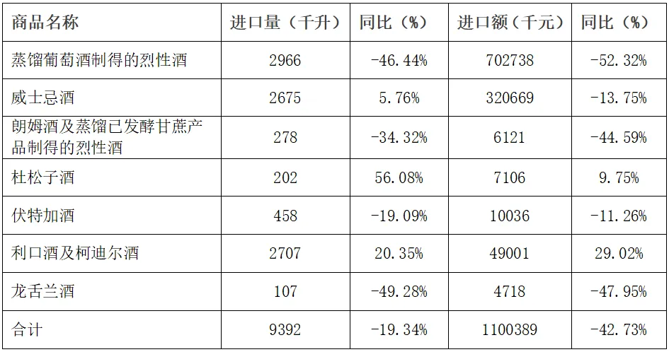 威士忌酒本月进口量2675千升,同比增长5.76%;进口额3.21亿元人民币,同比下降13.75%。龙舌兰酒、伏特加酒、朗姆酒及蒸馏已发酵甘蔗产品制得的烈性酒亦出现大幅下降情况。