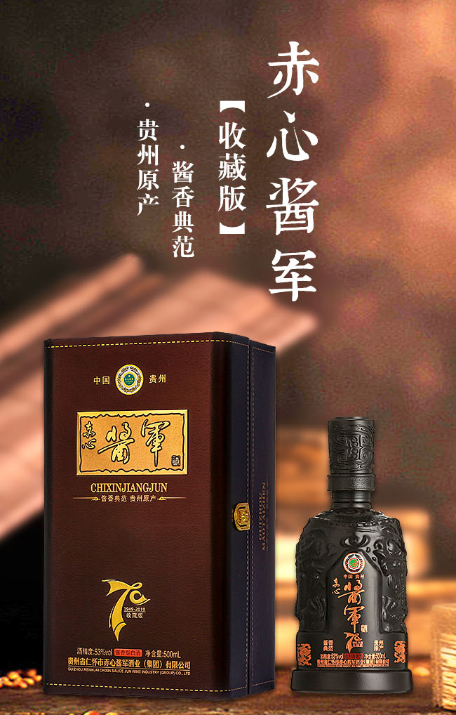 赤心酱军酒业(集团)坚持“秉承传统酿造工艺,传承企业文化”的经营理念,注重酒文化与人与自然的结合,精选本地优质红高粱、小麦,以赤水河河水为酒引,严格按照端午采曲、重阳投料之传统工艺生产。通过九次蒸煮、八次堆积发酵、七次取酒,通过长期窖藏,并由集团公司总工程师精心勾兑,产品具有酒体醇厚、酱香突出、幽雅细腻、回味悠长、空杯留香之特点。