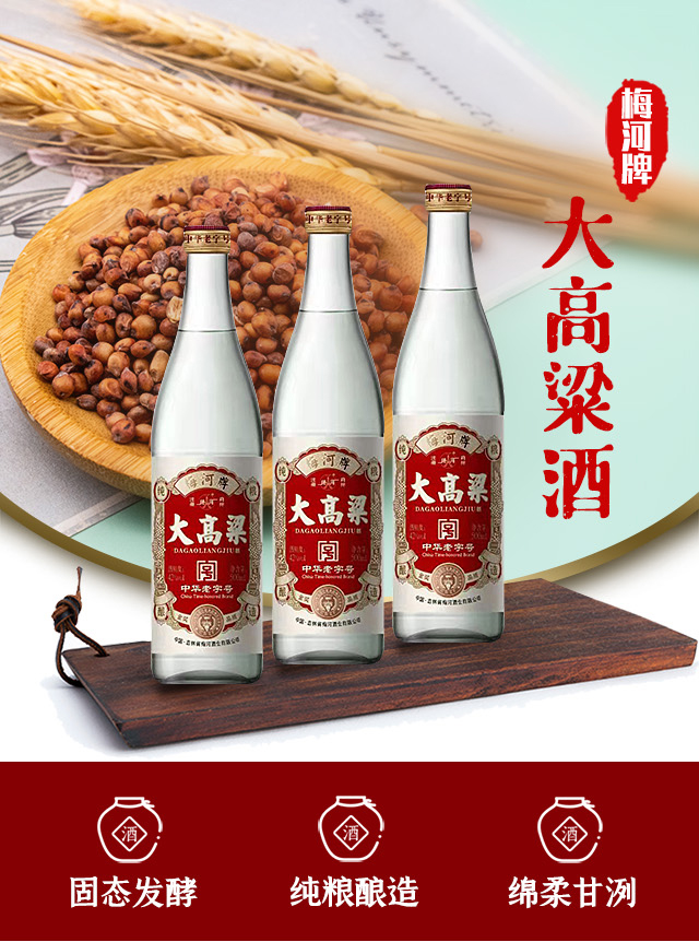 梅河高粱酒,始于公元1888年,清光绪14年,十代人历经134年传承发展至今,东北独特的地理环境和作物生长,造就了原产地的美酒闻名,顺应天时的自然规律,耐心等待粮食熟成,曲块慢慢发酵,坚守酿酒匠人们对传统技艺的执着与骄傲,采用百年老窖池,人工纯粮固态发酵,窖泥中丰富的氨基酸和微生物,会使酒的香气更加浓郁醇厚,将粮、水、曲三者调和的回味悠长,入口绵柔,唇齿留香,光绪曾赞叹:此酒醇而不烈,甘而不过,醉而不伤,真乃佳酿也。