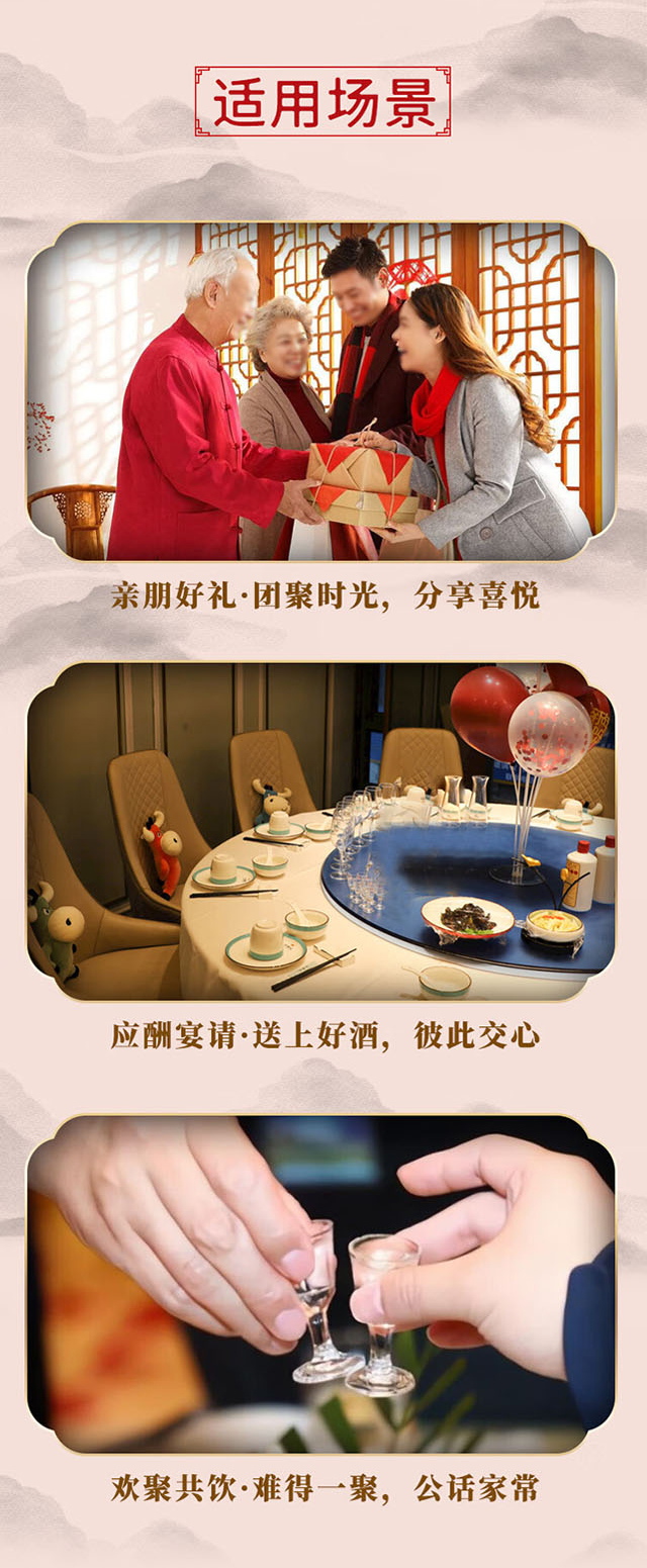 使用场景:商务接待、宴请、聚会、自饮、收藏,金红搭配外观寓意繁荣与喜庆